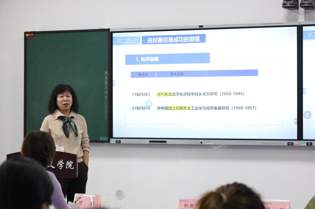 讲座中,荆蕙兰紧扣主题,以系统视角全面解析课题申报的学术路径与实践要领。通过阐述国家社科基金项目的战略定位与学术价值,强调申报过程本质上是对科研思维与综合能力的重要锤炼。在选题环节,指出“选好题目是成功的前提”,并结合丰富评审经验,剖析了选题应具备的前瞻性、应用性与延续性,借助案例具体说明如何立足国家战略、区域特色与学科交叉点凝练真问题。围绕“做好论证是成功的关键”,系统讲解了申报书的逻辑结构与写作规范,强调从文献综述、内容框架到创新凝练应环环相扣,同时分享了提升文本学理深度与可读性的具体方法。在团队建设方面,进一步阐述“组好团队是成功的保障”,结合自身经验,探讨如何构建结构合理、梯队衔接、协同高效的科研团队,并通过资源整合与常态交流保障研究可持续发展。