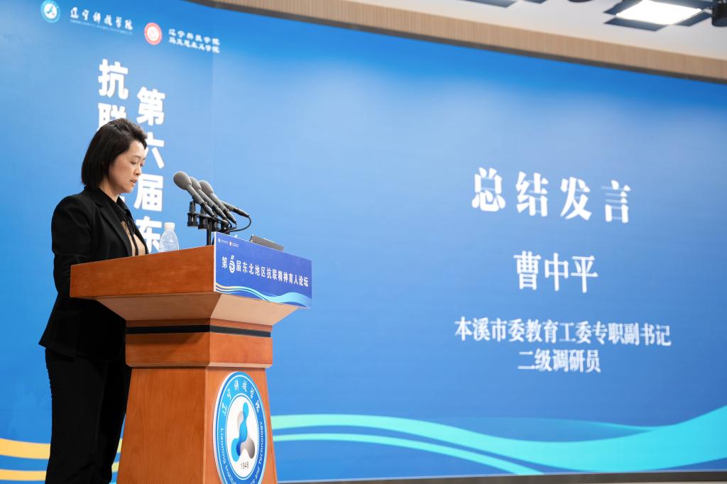 本溪市委教育工委专职副书记曹中平在总结时,向给予第六届东北地区抗联精神育人论坛大力支持的各单位以及与会的专家和大中小学教师们的精彩展现表示衷心感谢。她表示,此次活动为全学段的思政课教育工作者提供了理论支持与实践指导,明确了一体化建设构建红色育人全链条的具体路径。她强调,未来要凝聚合力,以守正创新开拓协同育人新格局,紧密衔接国家“十五五”规划的战略部署,形成新时代东北抗联精神育人的新范式,为服务辽宁全面振兴、建设教育强省贡献本溪力量!