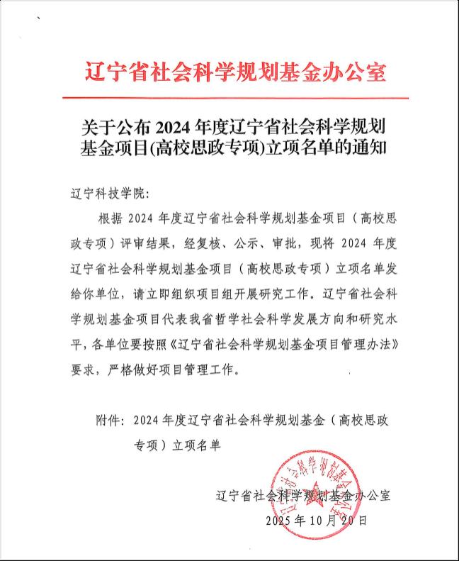 近日,辽宁省社会科学规划基金办公室正式公布了2024年度辽宁省社会科学规划基金项目(高校思政专项)立项名单。马克思主义学院申报的《东北抗联精神赋能新时代高校“大思政课”建设研究》项目成功获批,被确定为重点项目,项目批准号为L24ASZ018。