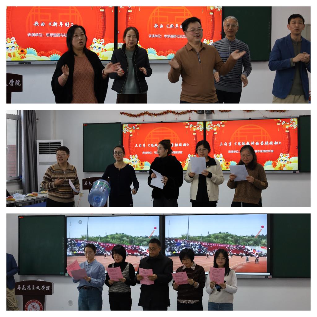 文艺表演环节精彩纷呈,尽显马克思主义学院教师的多样风采。在教立营、薛忠祥两位主持人的引领下,各教研室及青椒工作室精心准备的节目轮番登场。思想与道德与法治教研室带来的歌曲《新年好》旋律轻快、喜气洋洋,瞬间点燃现场氛围;马克思主义基本原理教研室的三句半《思政教师的苦辣酸甜》以诙谐幽默的语言,生动展现了思政教师的职业坚守与责任担当,引发全场共鸣;毛泽东思想和中国特色社会主义理论体系概论教研室的配乐诗朗诵《红韵铸魂 钢骨迎新》,声情并茂地抒发了马院人传承红色基因、践行育人使命的赤诚之心;习近平新时代中国特色社会主义思想概论教研室的《同一首歌》、中国近现代史纲要教研室的《铭记》等节目,或深情婉转,或激昂澎湃,传递出对祖国、对教育事业的无限热爱;青椒工作室的歌曲串烧则活力四射,展现了青年教师的青春朝气与蓬勃活力,赢得现场阵阵掌声。